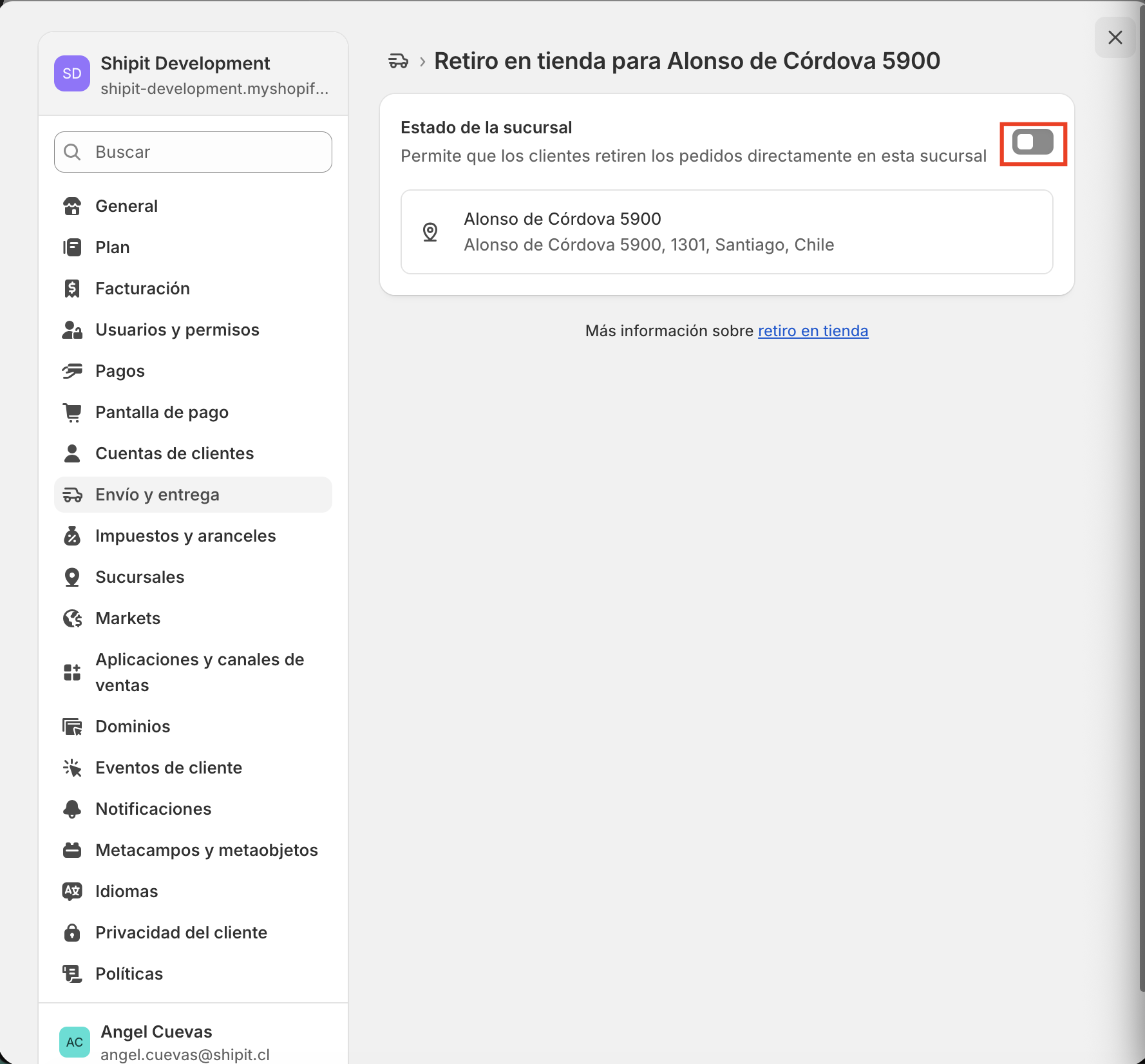 Importante: Debes asegurarte de que la sucursal que ofrecerá retiro en sucursal posee inventario.