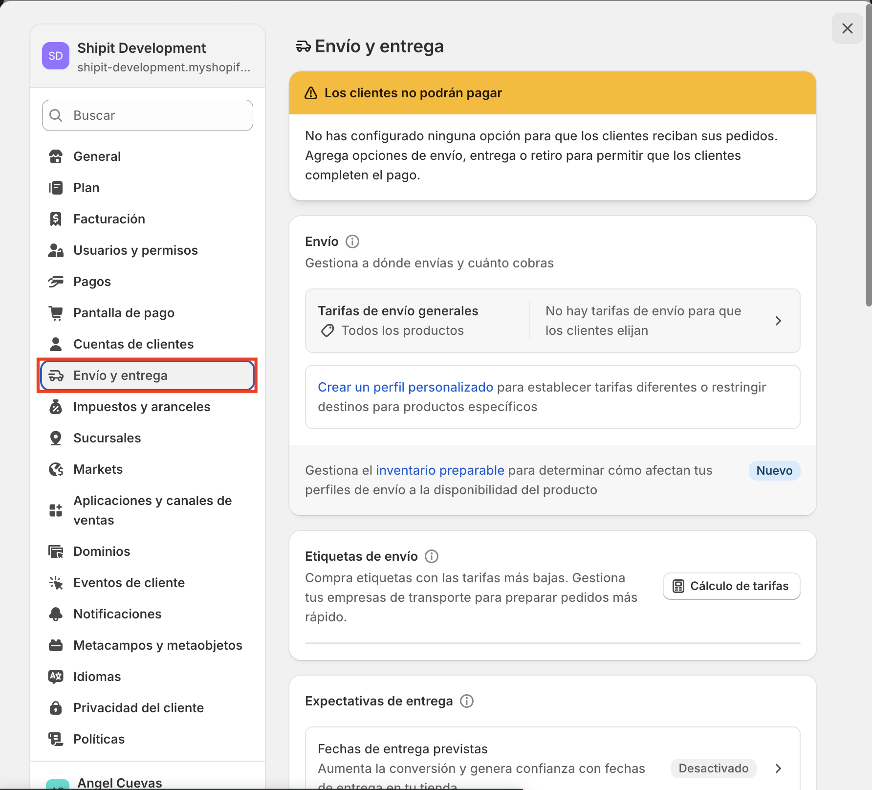 Ve a Configuración → Envío y entregas (Shipping & delivery).