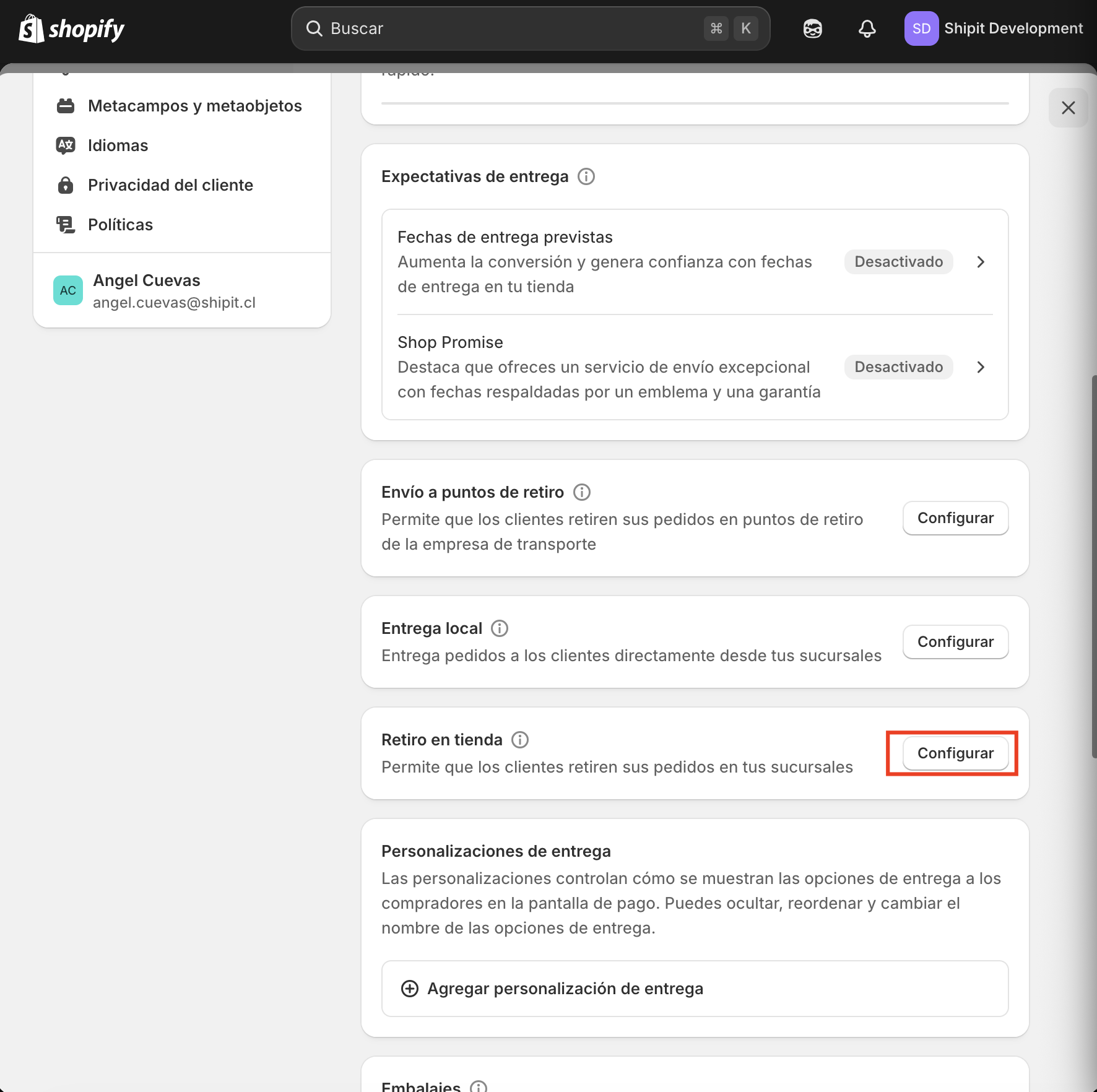- En la sección Retiro en tienda (o “Local pickup”), haz clic en Configurar o Editar.