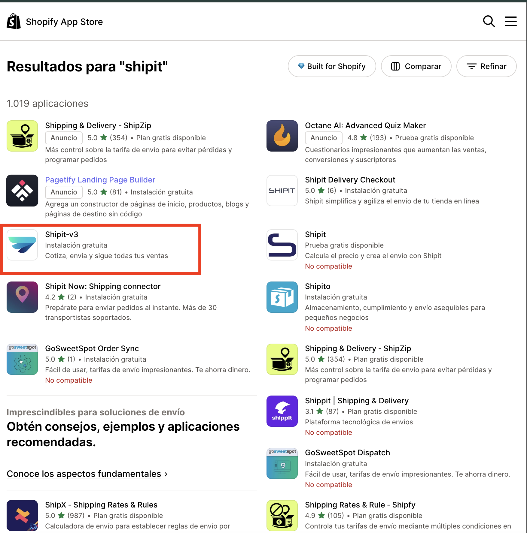 Instala la app Shipit-v3 desde la Tienda de aplicaciones de Shopify.