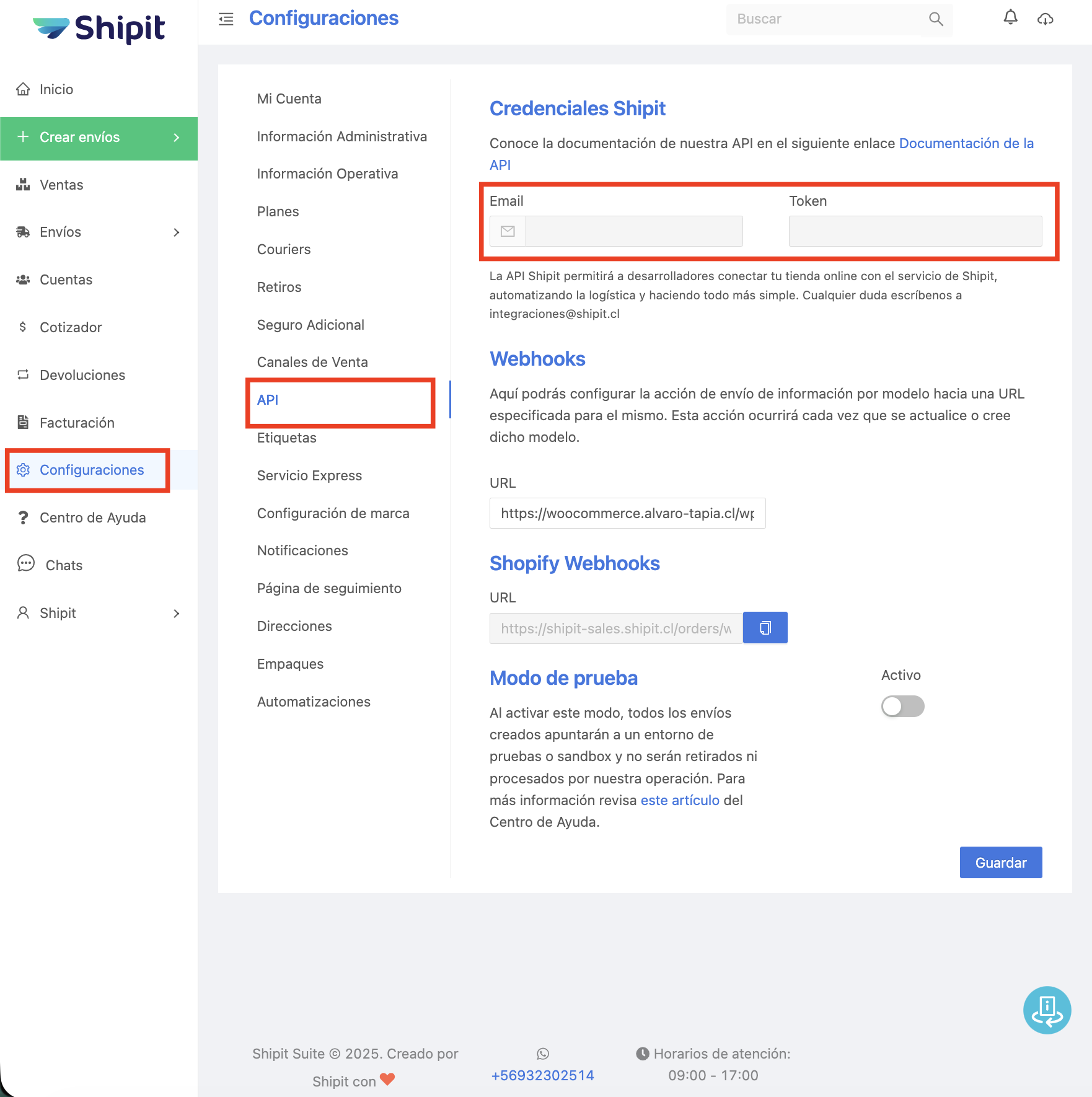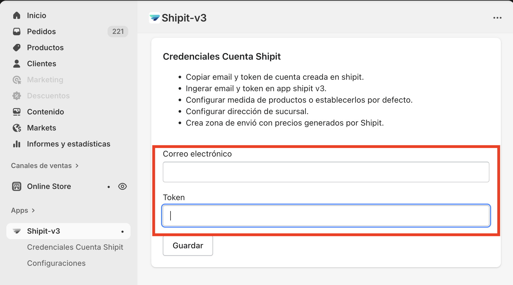 Ingresa correo y token de tu cuenta Shipit, estos los puedes ubicar iniciando sesión en shipit e ingresando a la sección Configuraciones - API
