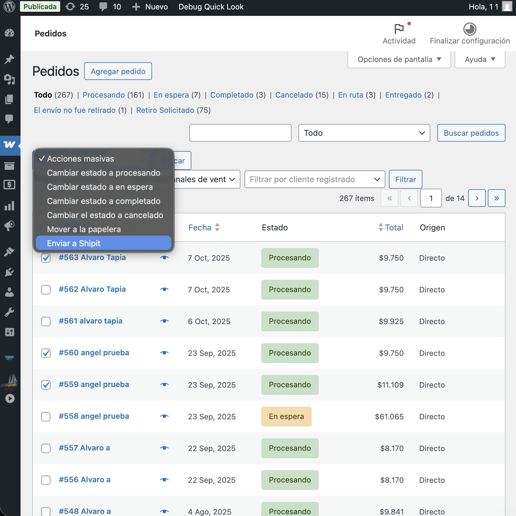 4. Presiona la opción "Acciones masivas", y elige la acción "Enviar a Shipit".