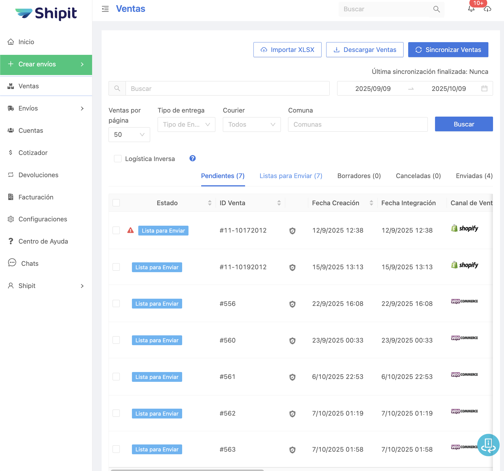 6. ¡Listo! Ahora podrás ver en tu cuenta Shipit los pedidos que han sido sincronizados manualmente para empezar su proceso natural de envío.