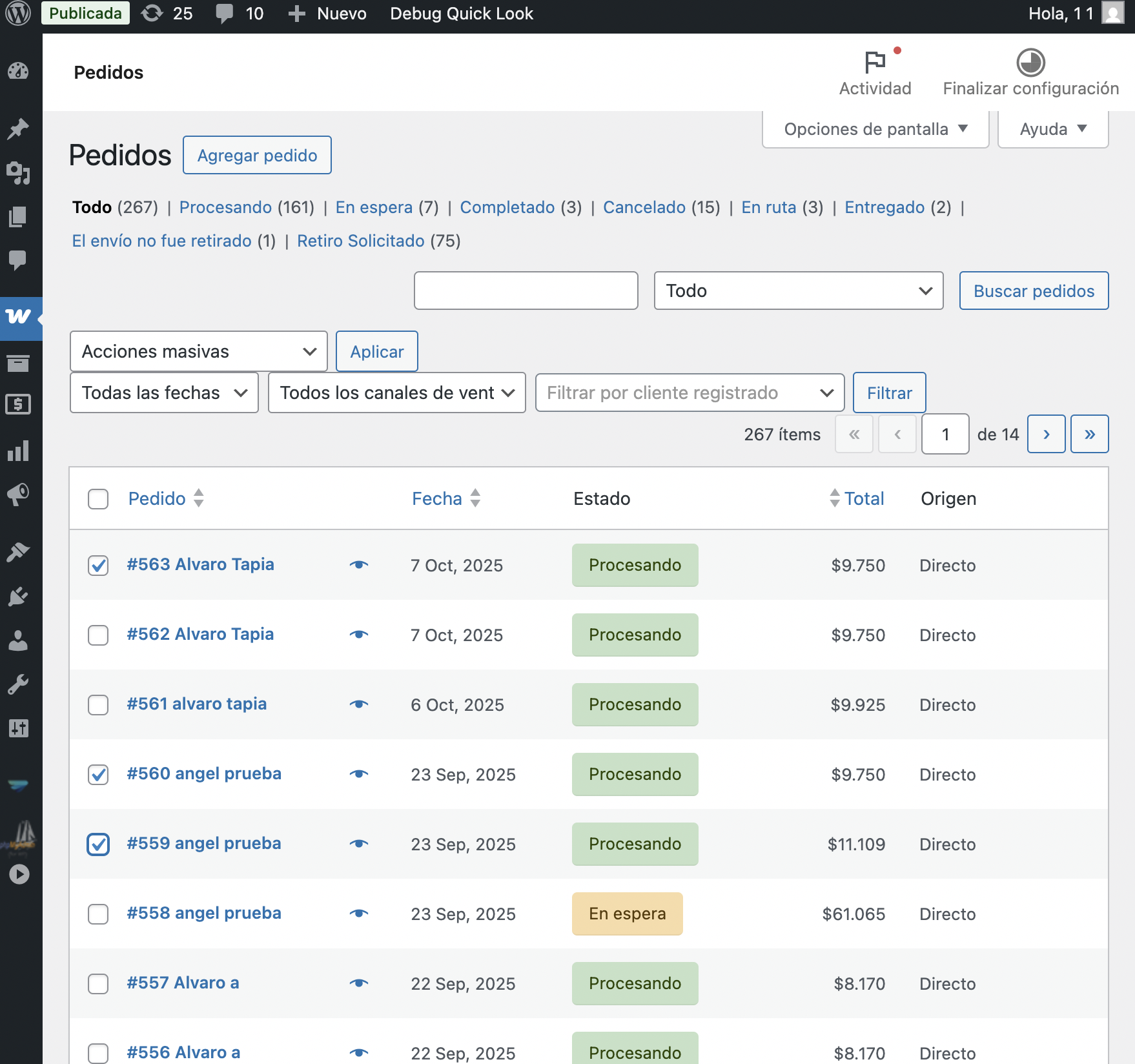 2. Dirigirte a la sección "WooCommerce" > "Pedidos", de tu sidebar lateral izquierdo.