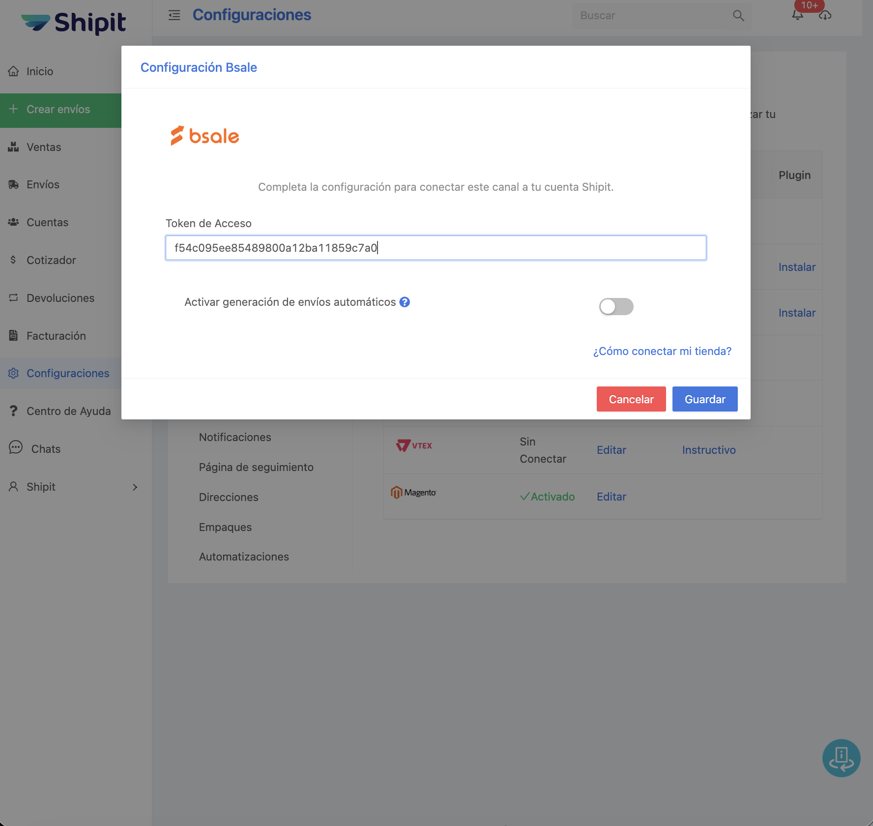- Ingresa el token de acceso entregado por Bsale dentro del campo designado, para luego seleccionar “Guardar”.