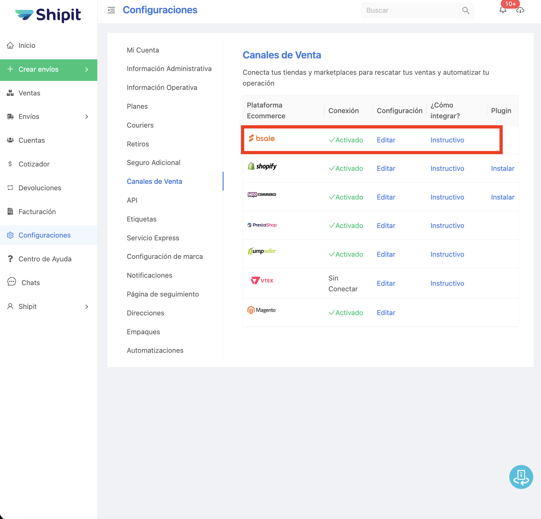 - De vuelta en tu cuenta de Shipit, dirígete a Configuraciones > Canales de Venta y presiona el botón “Editar” de la fila Bsale.